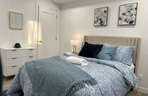 The bedrooms are thoughtfully furnished, with bed linens, extra pillows, and blankets ensuring a restful night's sleep. Catch up on your favorite shows on the TV, or stay connected with the provided WiFi and dedicated workspace. Air conditioning and heating ensure your comfort in any season. Iron, ironing board, and clothing storage are also provided for convenience.