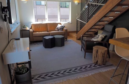 This light and bright top-floor, loft-style condo features high ceilings and big windows with unobstructed mountain views. On the sunny side of town, just blocks from Chair 7, Main Street, restaurants, and shops, everything is walkable. A free parking space is provided. There is one queen-size memory foam bed upstairs and a queen-size memory foam pull-out sofa downstairs. The condo is equipped with wifi, Apple TV, a Keurig 2.0 coffeemaker, Nest thermostat, and more. Enjoy the privacy, views, hot tub, and proximity to everything in Telluride.