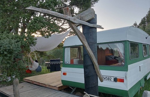 At Down to Earth NZ we have recently restored a 1960 retro caravan privately nestled under a Totara tree with wood fired heater, fridge and solar in landscaped grounds with its own private woodfired bathtub on the edge of a mature olive grove and Orchard. Le Olive is self contained with sunset and sunrise views and privacy. You will enjoy the nature surrounding you, our friendly calves coming for cuddles, the melody of birds, having a swim in the pond, ,enjoying star filled clear dark sky. Walk around and discover the permaculture gardens, yoga deck, badminton court and enjoy seasonal changes like misty Autumn valley views, Wildflower Meadows and our developing food forest.
