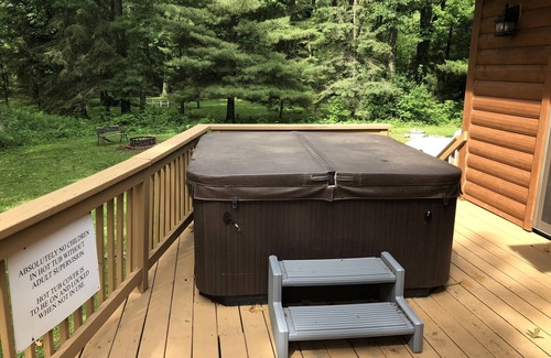 OUTSIDE: Full deck with chairs and table, hot tub, fire pit, tram and stairs down to the lake, fish cleaning table.