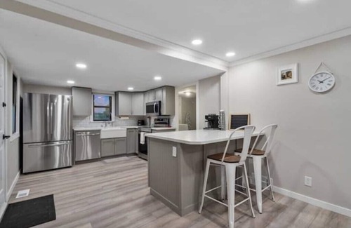 Walk in and find storage space for all your gear and equipment and seating for 6 on the sectional and two recliners in the family room. It’s the perfect place for everyone to enjoy a movie and to warm up by the fire after a day at the ski resort. A separate dining area and large island provide plenty of space at mealtime and a great place to sit and work if needed. (We also offer high-speed internet and a smart TV with access to your favorite streaming services).