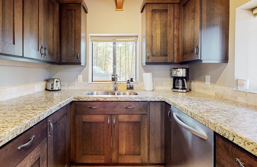 Adorned with fun pops of color, warm wood finishes, and modern furnishings, the interior of your retreat embodies a welcoming aura. Throw a log on the wood-burning stove and cozy up on the soft sofa while tuning into your favorite movie with a loved one.