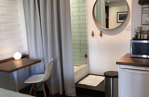 Our downstairs studio is like a small, cozy hotel room with its own private entrance, a kitchenette, bathroom and a comfy bed. It's tiny but equipped with everything you will need for a comfortable visit. This unit is downstairs from our home, but is all yours, with everything you need for a short stay in SF. Near the lively Mission district and quaint Cortland Ave. Of course, it is professionally cleaned and sanitized after each guest.
