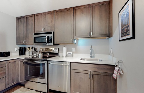 Come and relax on the deck with a glass of wine or morning coffee, enjoy fresh the mountain air, and take in the surrounding mountainscape with a majestic view of Mt. Crested Butte. This modern, comfortable condo features an open floor plan with living/dining/kitchen areas along with hardwood floors. The living area includes a large flatscreen Smart TV with cable/WiFi access for your streaming accounts and a cozy electric fireplace. Enjoy making a home-cooked meal or snack in the fully equipped kitchen with new stainless appliances, including a dishwasher and quartz countertops.