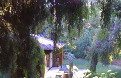 This fully furnished cottage is located in a private garden setting next to a small waterfall and stream. It has a queen bed, a loft for storing suitcases, a table for dining or working on your computer, a kitchenette with a small refrigerator and sink for cooking.