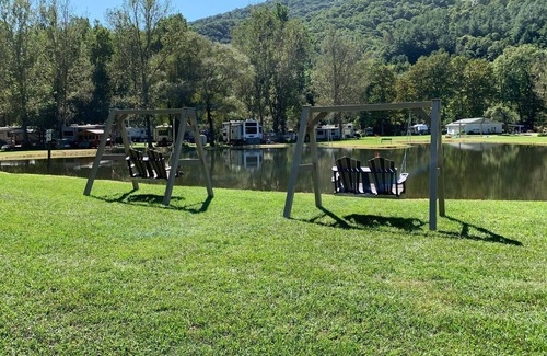 Our property sits along 1600 ft of the North Toe River (stocked with Trout) and is 10 miles off the Blue Ridge Parkway in Western North Carolina. Our Couples Cabin has beautiful views of our open grass fields, fishing pond and mountains. Enjoy s'mores by your fire pit any time of the year! Or grill out using our communal park style charcoal grills by our pond. You bring your own linens or a sleeping bags, your fishing poles, and your hiking shoes (the campground features 144 acres of hiking trails in the Blue Ridge Mountains.) The campground also has a laundry facility, arcade room (newly renovated with billiards, 4 pinball machines, air hockey, and arcade games) and a dedicated fiber service that provides free high speed internet all over the campground! We also added a basketball court and pickleball courts for our guests to enjoy. The campground also has a laundry facility, arcade room (recently renovated with billiards, 4 pinball machines, air hockey, and arcade games) and a dedicated fiber service that provides free high speed internet all over the campground! We also added a basketball court and pickleball courts for our guests to enjoy! Snow lovers we are only 12 miles from tubing at Jonas Ridge and 22 miles from Skiing at Sugar Mountain!