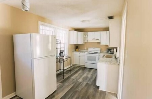 Enjoy a 2 bedroom 1 bathroom home with Queen Sized Beds. Cozy, home has livingroom/den, dining room, kitchen and laundry room. Unlimited Wifi. Kitchen is outfitted with coffee/wine station, utensils and kitchen equipment for a relaxing productive stay. Porch with rocking chair.