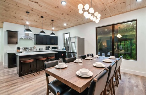 Each cabin has 5 bedrooms; 4 king beds and 1 room with 2 twin-over-twin bunk beds. Throughout the house the bedrooms are paired with bathrooms so you aren't waiting to take that shower after your hike or day out on the town.