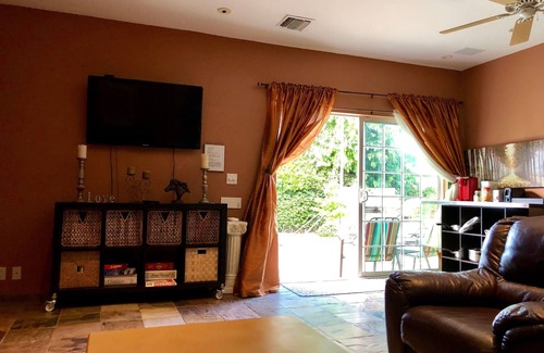 This is a two story guest house on the back of a quiet property. The owners live in the front and are available to help address any issues you may have. Guesthouse includes a kitchenette (there is no oven) and washer/dryer for your use in the attached garage. There is a master bedroom and a loft area (as second bedroom) please review all pictures. This is a fun, warm, cozy private home with access to a pool and Jacuzzi right outside your door. If your party is larger than 5 people you have access to a high quality inflatable mattress that comfortably sleeps another guest for a maximum of 8 guests. Please note that depending on the season the pool may have leaves in it. We have a dedicated pool person that comes on Tuesday but winds do kick up and blow leaves into the pool from time to time. We do our best to keep it clean, weather permitting.