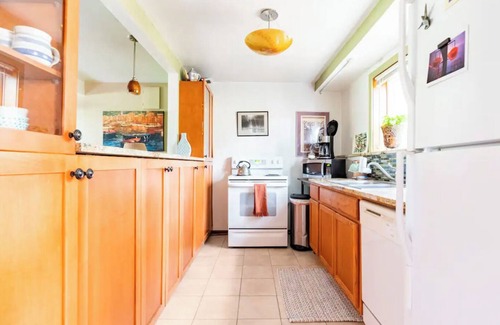 The entire ground floor of a split-level home is yours to enjoy during your stay - one bedroom, one bathroom, a full kitchen, and living room. The bedroom has a comfy queen bed, with an additional queen hide-a-bed couch in the living room, sleeping four comfortably. The washer and dryer are also available for you to use during your stay.