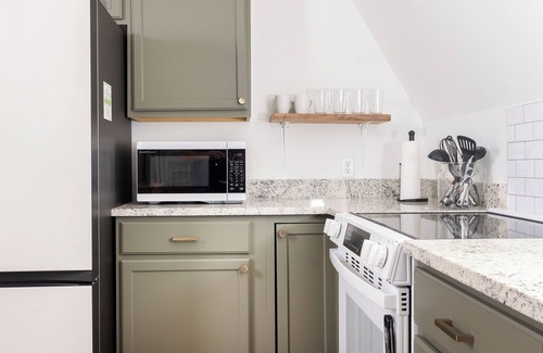 The kitchen is fully equipped with beautiful appliances including a stove, refrigerator, and dishwasher. The smaller appliances include a blender, toaster, coffee maker, Keurig, and an electric kettle. The kitchen also contains pots and pans, cooking utensils, bakeware, and other essentials needed for dining in.