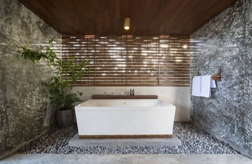 The resort is centered around a stunning pool lagoon that acts as an oasis on a hot tropical day. The garden and stone pathways will lead you to the beautifully-design villas. The house has a unique facade of a circular shape made of bamboo. The rest of the structures are also dominated by natural materials, like wood, bamboo, and stone. The rooms are spacious and open, allowing you to enjoy nature at its finest.