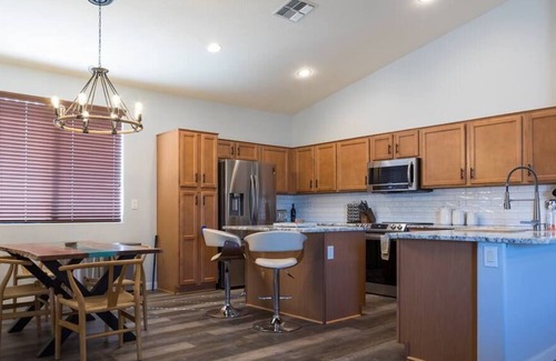This cozy 3bd/2ba property located in a quiet Buckeye neighborhood near the I-10 freeway. The homeboasts an open living area and kitchen w/ dining area and a large master bedroom w/ attached bathroom and walk-in closet. The kitchen is fully equipped and stocked and upgraded with stainless steel appliances and granite countertops. There is also a covered back patio with cushioned seating, propane fire table, propane BBQ, and pool (heating optional with a fee).