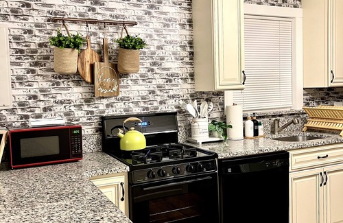 The kitchen comes equipped with all the appliances needed for cooking as well as utensils, pots, pans, and baking sheets. The breakfast bar seats 2 guests. Refrigerator/ice maker, gas stove, dishwasher, blender, mixer, and Keurig coffee maker (we provide dark, medium and light roasts, sugar and coffee cream) and Early Grey teas provided.
