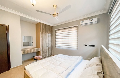 Exclusive home away from home with all the necessary essentials to have a comfy stay. The place is manned with 24 hour security service, electric wall fencing and the compound is CCTV monitored. There is free WiFi, DSTV and free parking available on site. Electricity becomes the responsibility of the guests once initial 300cedi top up is exhausted (see house rules for more info). This unit is located on the third floor which makes the space very airy.
