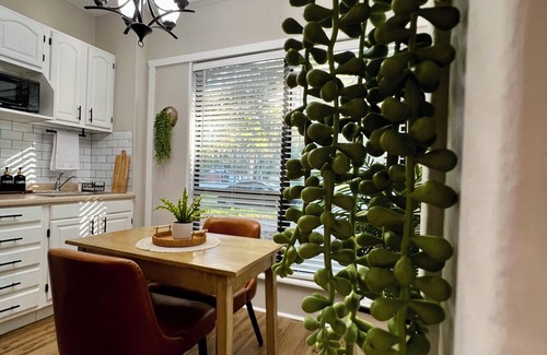 Unwind and recharge in this welcoming studio apartment located in the heart of Gainesville. The studio is located in a quiet family neighborhood just off a main avenue. The space features a queen-size bed and a futon for one extra guest, along with a compact bathroom that includes a narrow shower. Guests will enjoy the pretty decor, peaceful atmosphere, and the natural setting surrounded by trees and local wildlife. The studio has its own private entrance with a few steps leading in, and dedicated parking for one car is available (additional parking on request).