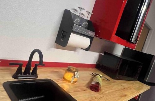Stay over in this unique converted garage with a modern toolbox theme! Private bathroom and kitchenette. AC!