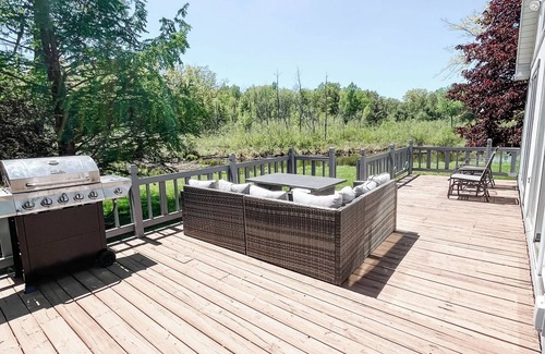 On the deck, there are beautiful views from the comfortable rockers as well as the wicker couch furniture! Next to this, you will find a nice gas grill with 2 propane tanks provided to ensure your cooking goes off without a hitch!