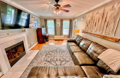 The first floor has a grand-size living room with an oversized L-shaped couch, smart TV, desk, and Steinway piano. There is a half bath, laundry room with full-size washer and dryer, and fully-stocked kitchen with bay window and view of the creek. We are centrally located, so you can easily cook a meal, eat out, or order in if you’d like.