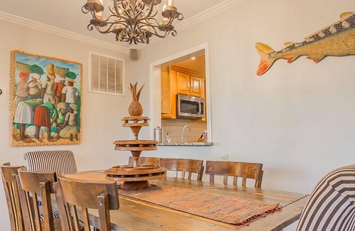 Forget your worries in this dreamy space that invokes all of the feelings of a tropical vacation. Lovingly decorated & landscaped with a sprawling 5 bedroom 3 bathroom home with 9 beds, 3 dens, 2 kitchens, screened patio, fireplace, fire pit, creekside hot tub & a dock on beautiful Horsepen Creek. Bring your small boat! Bikes, kayaks, fishing poles & beach gear provided. Stop by our brewery & have a beer with us! We are thrilled to be able to share our dream home with you! STR2022-00262 & 00261 - PARKING: parking for up to 5 cars