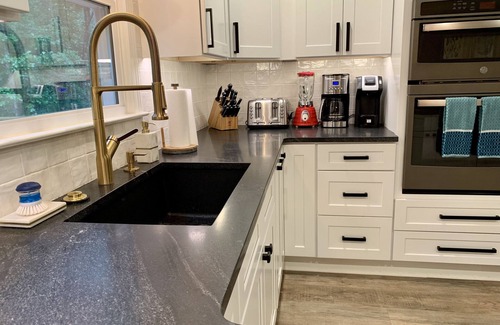 The private dock is ALL yours! Pull your boat right into this party dock, which has cleats on all three sides to accompany multiple watercraft. This lake house is perfect for hosting multi-generational families. The gentle trail down to the dock is the top reason returning families book our home year after year, as most homes on Lake Lanier have multiple stairs, steep inclines, and/or long treks to their docks. Large groups appreciate having 3 King Beds: 2 Primary Ensuites (1 on the Main Level and 1 Upstairs), another King bedroom (upstairs), 1 Queen bedroom (Upstairs), and one huge bedroom with 3 bunk beds (twin over full) in the basement. We also have a twin futon (mattress can be easily moved to add to any of the large bedrooms) in a nook between the second stairway between the upstairs Primary Ensuite and the middle bedroom (king). The open-concept kitchen/living space on the main level has all-new kitchen appliances, making cooking a joy! The kitchen is fully equipped (details below). We also have a second refrigerator and freezer in the basement closet for overflow food and beverages. Relax on the front porch or on the backyard large screened-in porch or deck w/ large outdoor table overlooking the forest and lake. The third (covered) deck off of the ping pong room's double french doors houses a new Weber propane grill. We provide propane, but please tell us if it running low at the end of your stay. The backyard is fully fenced, so you can keep dogs/small children safe. The musicians in the family will appreciate having a piano and guitar available to jam during downtime. We have a second refrigerator in the basement to help accommodate large groups.