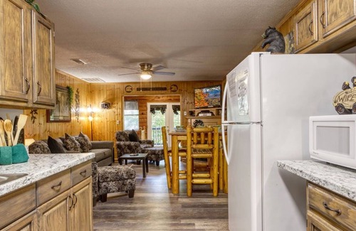 "Cub's Corner" is a 4 bedroom 2 bathroom cabin that sleeps 8 and is 2 levels. You will not have any steps to enter the cabin when you do you will be stunned by all the comforts of home. On the main level, you will have a fully equipped kitchen with dining for 8. Stretch out and relax on the couch while watching your favorite show on the Flat screen TV. On those cold winter nights grab a blanket and snuggle up in front of the gas fireplace. There are 2 King bedrooms with each having a Flat screen TV and they share a full bath with a tub/shower combination.