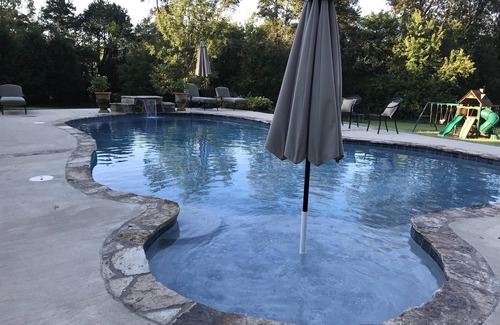 4 bedroom and 3 bath. Over 3000 sq feet. Custom built home in a quiet neighborhood on 12+ acres. 2 fireplaces. Screened in porch with fireplace and TV. Kid friendly. Pet friendly. 9-12 foot ceilings throughout the home. Plenty of parking for multiple families. Inground custom gunite pool built in 2016. Plenty of couches for additional sleeping.