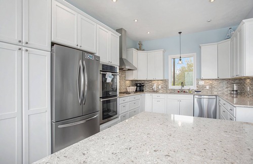 Getting hungry? Our home is equipped with a fully stocked eat-in kitchen, boasting state-of-the-art stainless steel appliances and a kitchen island breakfast bar. Brew a drip coffee while you begin meal prep from the spacious granite countertops. Then come together to enjoy a delicious meal around the six-person hardwood table in the sunny dining room. This spot is perfect for admiring magical sunsets.