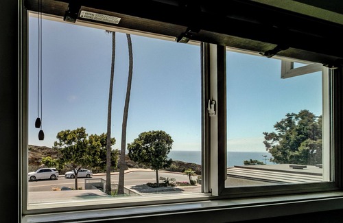 Enjoy your morning cup of coffee with the best view of the Pacific Coast! This corner unit is your home away from home. Located on beautiful Dana Point, this condo is nestled directly above Strands Beach and across the street from the Headlands Conservation Area. The South Strands Beach access is just steps away and the Headlands Open Space trailhead is right at the end of the street and offers amazing views and a nature interpretive center. The sandy beach below even has a raised walkway in the event of king tides and is protected by seasonal lifeguards. In addition we have a lovely heated pool on the common area with plenty of seating and a BBQ grill. The headlands trails also provide access to Del Prado and the downtown area with lots of great shops and restaurants. When you're ready to relax but still want to indulge in that lovely ocean breeze, head inside your retreat where carefully curated decorations adorn every room including works by local artists and historic surf & paddle memorabilia. Sit on the living room sofa or love seat while tuning into a movie on the large TV and enjoy the whitewater views. Open the doors to the private balcony and feel the radiant California sunshine kiss your skin. And reach for the binoculars to watch the surfers below or catch a glimpse of marine life offshore. The well-equipped kitchen is sun-soaked with its large window allowing ample natural light in. Cook amongst the stainless steel appliances and tiled countertops in this space before serving your culinary creations at the adjacent dining table, or alfresco on the balcony. The second bedroom features two twin beds and a wall mounted TV (for longer term guests we can convert this into an office with a sectional sleeper sofa and a desk and office chair). Before bed, soak in the tub or rinse off in the shower, then tuck under the plush linens in the bedroom, ready to dream about another day in paradise!