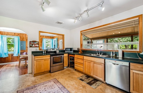Take a trip across Puget Sound to Whidbey Island to enjoy a relaxing getaway together at this cozy, family-friendly cottage. Inside this charming vacation rental, you'll find a well-equipped, modern kitchen with stainless steel appliances, a dining table for six for meals or rainy day games, and a living area with a comfortable leather sectional sofa, flatscreen TV, and a warming wood stove for those chilly winter nights. And outside, relax on the furnished deck, fire up the gas grill for perfect summertime cookouts, or play in the large, grassy yard.