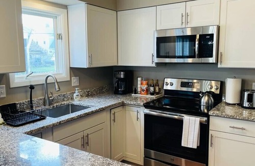 2 bedrooms with Queen beds, a massive granite topped kitchen with all new fixtures / appliances and a spacious living room with a large Roku TV with Disney+, Hulu and Netflix. The couch has a large ottoman that when nestled up to it, turns the whole thing into a futon bed. We are open to having up to 6 guests (2 would need to be small children in this case) provided you contact us about your plans beforehand and we are all on the same page about sleeping arrangements.