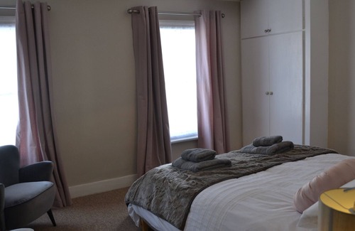 The main bedroom with a super comfy king-size bed and luxury feather duvet has bedside tables and lamps, has a beautiful dressing table and fitted wardrobes, very elegant.