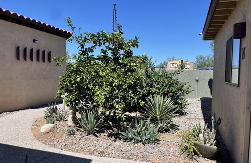 State Tax #21272215 Convenient location, near midtown Tucson. Casita M is a 400 square foot one bedroom with king size bed, one bathroom with walk-in shower, separate kitchen and living room. The unit has a nice size south facing walled private yard near the pool which is accessible from the bedroom. Carefully chosen fixtures and furnishings are for your comfort and enjoyment. All casitas are furnished with linens, blankets, and towels. The living room has leather furniture, a flat screen TV (cable tv), and the kitchen is fully stocked with cooking and dining utensils. The casita has its own full size washer and dryer off rear courtyard in closet. We do provide free secure parking in our gated parking lot for one car per casita. All parking is in assigned parking spaces. Traveling with a second vehicle, they are able to park on the street outside the complex, or if available we do have a few additional parking spaces for rent at $10 per night extra. Dogs up to 60 pounds allowed provided they are not a 'pit bull or pit bull mix', do NOT bark, and are not left in the unit alone unless crated. There is a limit of 2 dogs per unit. NO OTHER TYPES OF PETS ARE ALLOWED!