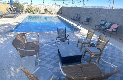 Yes, this Joshua Tree house has a swimming pool. Check the Facility Overview section for details about the pool and other available facilities.