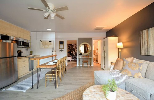 Welcome to Zen Yard! A hip one bedroom space in the thriving Phoenix Midtown area. Professionally decorated with style and comfort in mind. No details were overlooked in making this a top spot to stay for the area. Queen sized bed with top of line bedding and mattress in bedroom. Great room concept which features comfy couch, tv, dining table , and fully functional kitchen. Front patio with seating for 4! Located near populardining and nightlife options. A memorable vacation experience awaits!