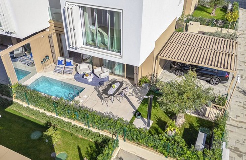 The villa includes a private parking space and covered parking, and is part of a gated, video-monitored residential complex with exclusive access to a beach equipped with loungers and umbrellas.