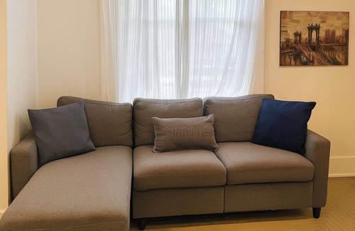 The inviting living room is equipped with a Roku-enabled TV and comfortable seating, perfect for movie nights or downtime after exploring the city. A dining area connects seamlessly with the fully equipped kitchen so everyone can share meals together.