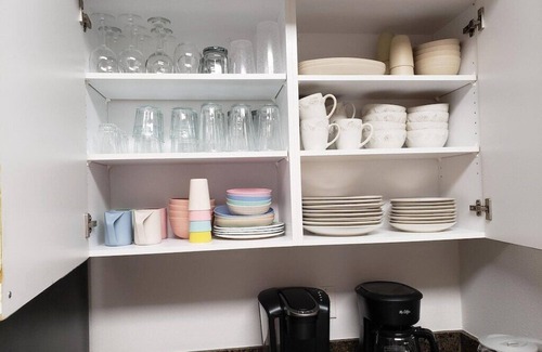 You will feel right at home with the granite counters, new furnishings, fresh paint, jetted master tub and walk-in shower, windows, and a full-size washer and dryer. The living room has a large sliding glass door leading to the balcony plus a sofa sleeper with a cooling gel queen mattress. The master and one guest bedroom adjoin a full bath. The second guest room is across the hall from a full bath. The kitchen has full size appliances, including a dishwasher. It is stocked with utensils, dishes and cookware, coffee pot and full-size Keurig, toaster oven, hand mixer, can opener, and more! Bring the food, paper and plastic goods or just dine out! There are plenty of options close by! The full-washer and dryer are conveniently located in the hallway near the bedrooms. The owner has provided a "mini" Kuerig coffee station in the Master and Queen Guest Bedroom for your morning convenience.