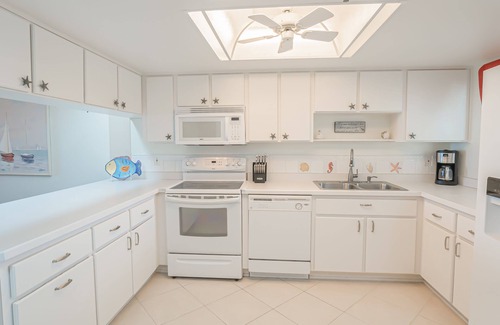 The kitchen is fully equipped with those beach-drink necessities: blender, wine and margarita glasses, as well as a coffeemaker, toaster, mixer, a full range of pots and pans, and sea-side serving dishes. In addition to the stacked full-size washer and dryer, this condo has lots of storage with an entry hall closet and roomy bedroom closets.