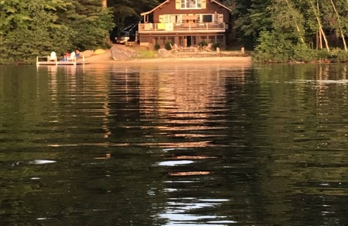 This direct waterfront log cabin is a rustic camp setting, with gorgeous western sunsets overlooking three mountain ranges, including Mt. Washington. Three bedrooms and one bath. Large log-beams and knotty pine interior. Swim raft and 20' boat dock for fishing and boating. Two kayaks, one canoe, and a paddle boat. Hugh fire pit in back yard for roasting s'mores. Lazyman's hammock in between the spruce pines overlooks the lake and mountain ranges. Playroom in loft area comes complete with doll house and legos. Puzzles and every board-game imaginable. Huge reading library. Smart TV, cable and Wifi. Complete kitchen with dishwasher and microwave. Cabin is located near all of North Conway's best vacation attractions including: StoryLand, Santa's Village, Six Gun City, Saco River, Kangamangus Highway, Skiing nearby at Mt Cranmore, Attitash, Wildcat, Black Mt and Shawnee Peak. Cross-country skiing, snowshoeing, ice-fishing, and snowmobiling right from our backdoor onto frozen lake directly behind.