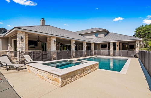 This two-story 7-bedroom, 7.5 bath home located in the wildly popular, gated Heartstone subdivision, Cazadores Escondite sleeps 26 in 3-king and 10-queen sized beds.