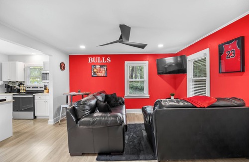 As you step inside, you’ll be greeted by the living room dedicated to Jordan's iconic years with the Chicago Bulls. Bold red and black decor and a 50-inch TV set the scene for watching classic MJ highlights or your favorite games. Relax on the comfortable couches and enjoy a cozy space designed to capture the energy of Jordan’s reign in the Windy City.