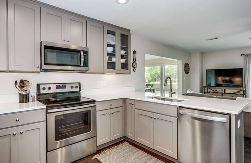 Launch & dock your boat at this serene waterfront, beautifully remodeled home located in Pensacola, FL. This four-bedroom, 2 bath home has everything you need to enjoy a family get-away. You can fish from the docks or take your boat out to Tarklin Bay and the connecting Gulf waters. The fully equipped kitchen has quartz counter tops and new modern appliances. The home sits on Weekley Bayou and has gorgeous views of the surrounding waters. There is a pull through garage where you can launch your boat. If you are planning on launching a boat please contact the manager regarding the specifics of launching directly from the house. Depending on the boat size you may have to launch from a public ramp, but will be able to dock at the house during your stay. The closest public boat ramp is located in Big Lagoon State Park (2.5 miles from the house).