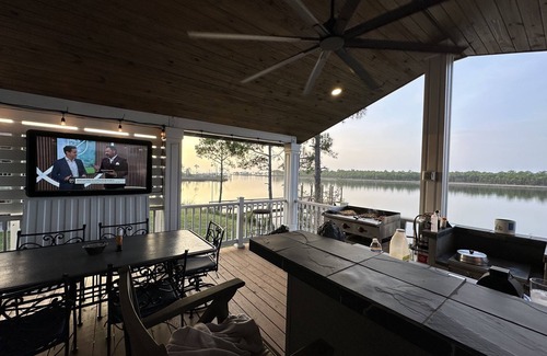 Reel Paradise is a recently updated waterfront home designed for both comfort and convenience. The main floor features an open living/kitchen area with bright coastal décor, a fully stocked modern kitchen, and bedrooms with crisp hotel-style bedding. Downstairs, a private queen suite with its own bath and bonus living room creates the perfect retreat for teens, in-laws, or friends — note that upstairs and downstairs are connected only by exterior stairs, offering privacy and flexibility for larger groups. Wide decks overlook Bayou Garcon, complete with a hot tub, outdoor TV, and a gourmet kitchen setup, fire pit, making it easy to cook, relax, or simply enjoy the water views. Watch the Blue Angles practice from the comfort of the back deck.