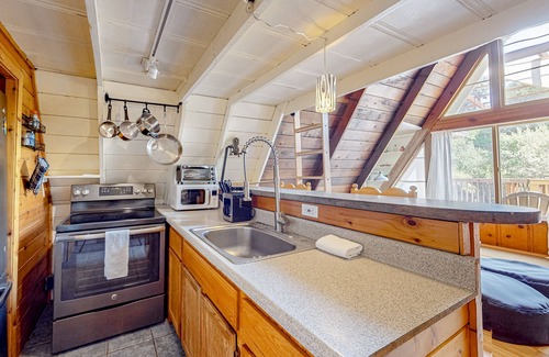 An atmospheric wine country retreat awaits at this A-frame cabin, a beautiful pocket of Glen Ellen free from the hustle and bustle of daily life. This is a place to immerse yourself in peaceful surroundings, sipping coffee on the deck with a view of the garden and curling up by the woodstove with a good book for company.