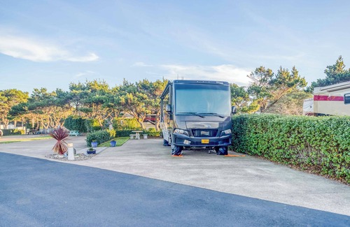 Stay a few steps away from the beach at the beautiful Pacific Shore Motorcoach Resort near Newport, Oregon.