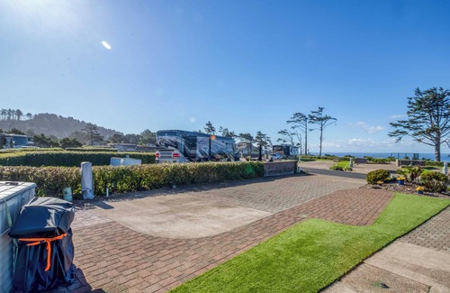 Stay a few steps away from the beach at the beautiful Pacific Shore Motorcoach Resort near Newport, Oregon.