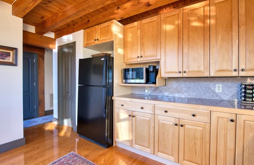 After a day full of fun in the sun, head back to your getaway where a mix of timber frame accents and large glass windows make it light and bright. Curated for comfort, the main living area boasts a beautiful, stone fireplace, soft seating gathered around its warmth, and a large TV. The adjacent full kitchen is any chef's dream with gleaming countertops and modern appliances. Enjoy preparing meals here while taking in the breathtaking views surrounding you. Gather with your loved ones and eat at the formal dining table or alfresco on the wrap-around deck.