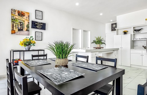 Inside your stylish, single-level villa, you'll find a well-equipped island kitchen with stainless steel appliances and counter seating. An adjacent dining table also stands ready for meals or family game nights. Indulge in an alfresco experience right outside or head up to your rooftop patio to soak up the abundant sunshine and take in the ocean view. A shared gas grill is also available for family cookouts.