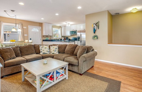 With two spacious floors, four comfortable bedrooms, tasteful nautical themes, and a newly refinished deck, there will be no delay in feeling right at home. When days heat up, the upper deck can accommodate tanning and reminiscing with loved ones, yet the lower level boasts a screened porch complete with seating and a gas grill for casual cookouts in the shade. When the sun begins to go down each day, dipping your toes in the water under pink skies will be a dream and everyone can gather inside when the stars come out. If more formal meals are on the agenda, the full kitchen is more than ready to assist in meal prep. Plus, the open layout will allow everyone to spread out between the dining table, sectional, and kitchen as needed while still being near each other. When it comes to entertainment, the free WiFi and flatscreen TVs have got you covered for favorite shows, social media, and more!